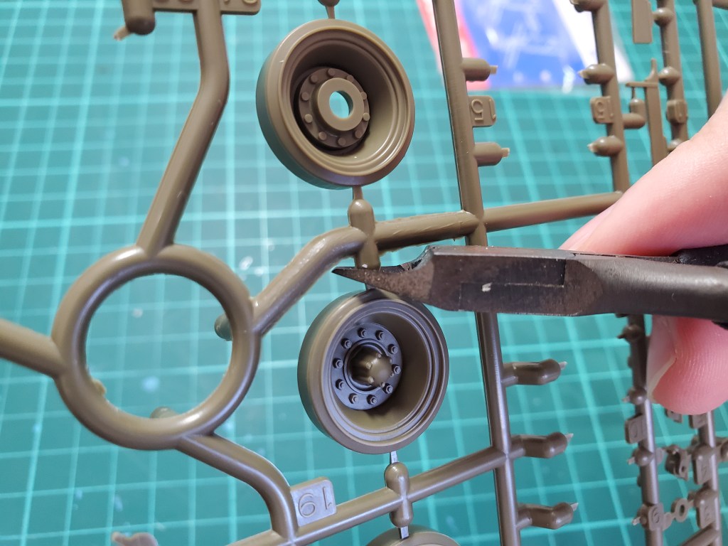 The first thing you see on the sprue is probably the rack of wheels. You’ll see how each wheel is attached to the plastic gate via a small strip of plastic. Unless the instructions tell you to do otherwise, cut the wheel from the sprue at a point on this strip using your nipper.