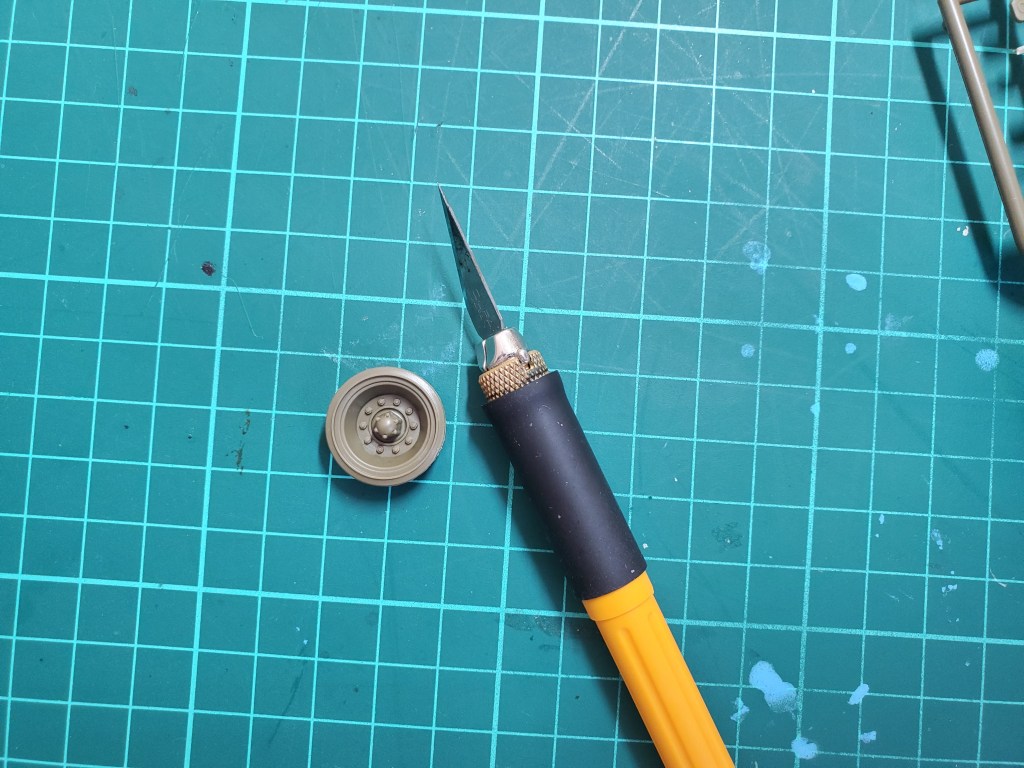 There are some who would cut off a large chunk of plastic to go with the wheel, before cutting and sanding the nub down with nippers and sandpaper. I personally like to cut as close to the wheel as possible, to avoid too much cleanup while also ensuring that the cut doesn’t leave a massive mark on the plastic.